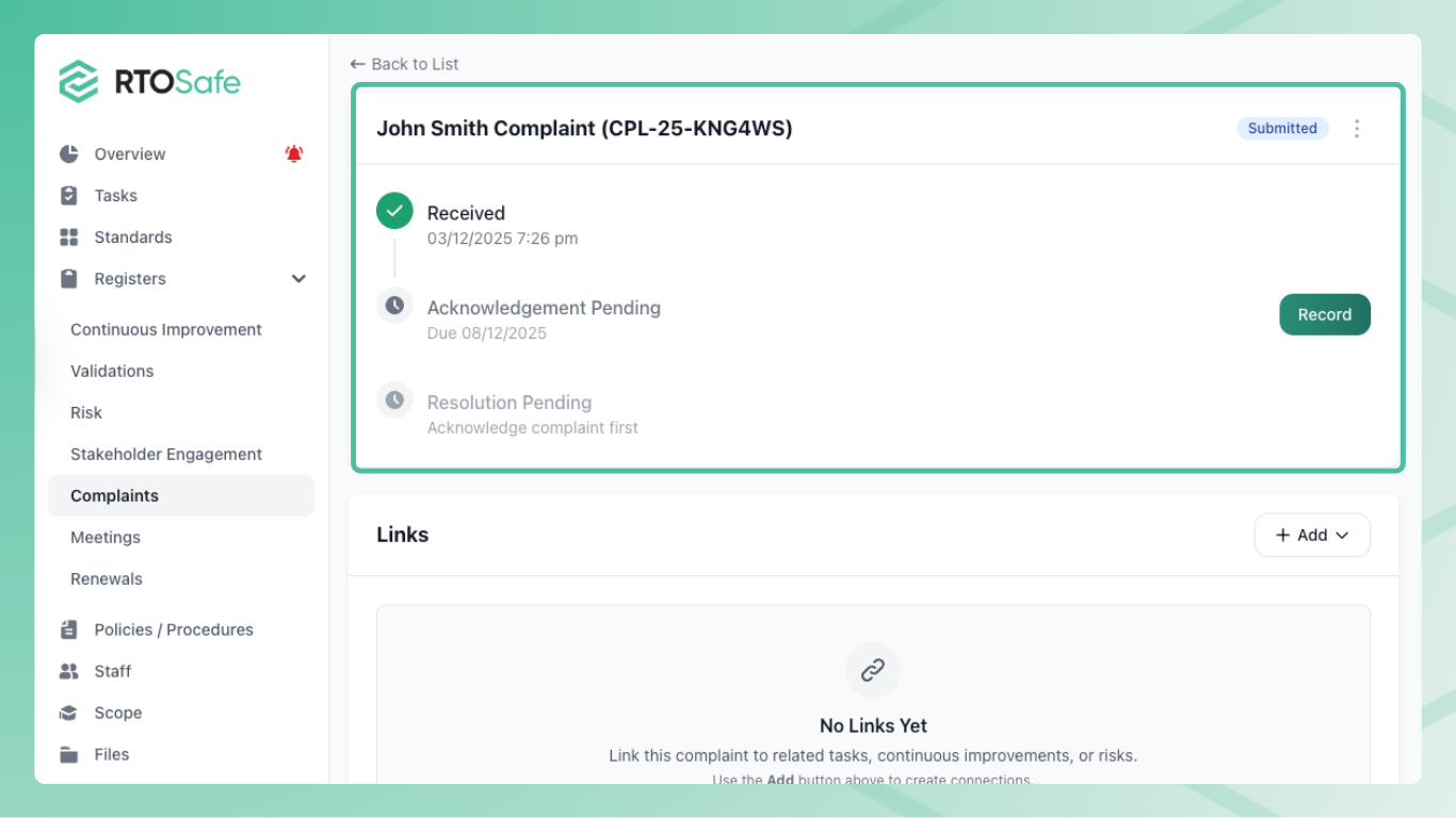 When a complaint comes in, you need to acknowledge it to the complainant within your configured timeframe.