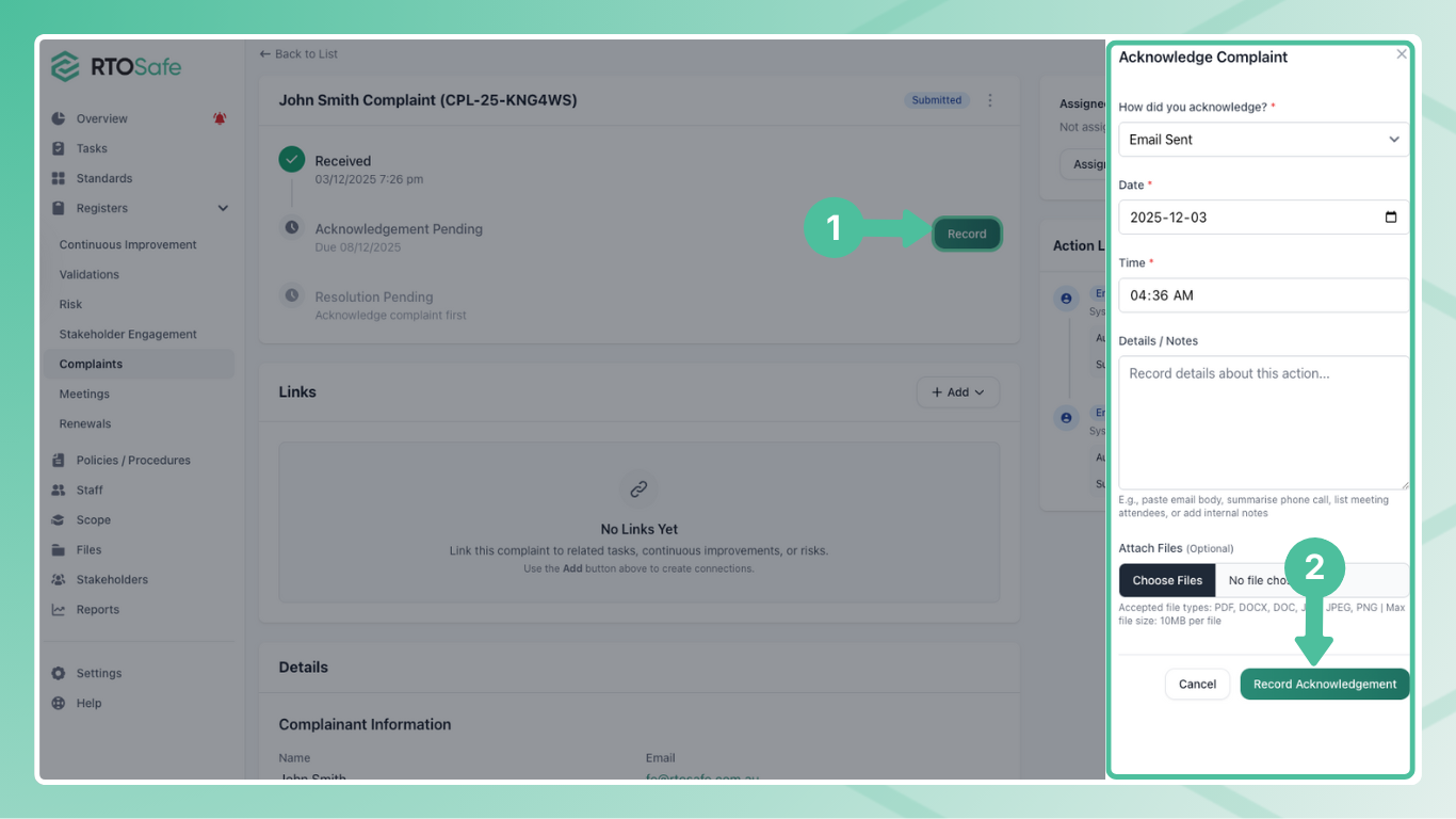 From the complaint details page, select Acknowledge. This opens a form where you record how you acknowledged the complaint: