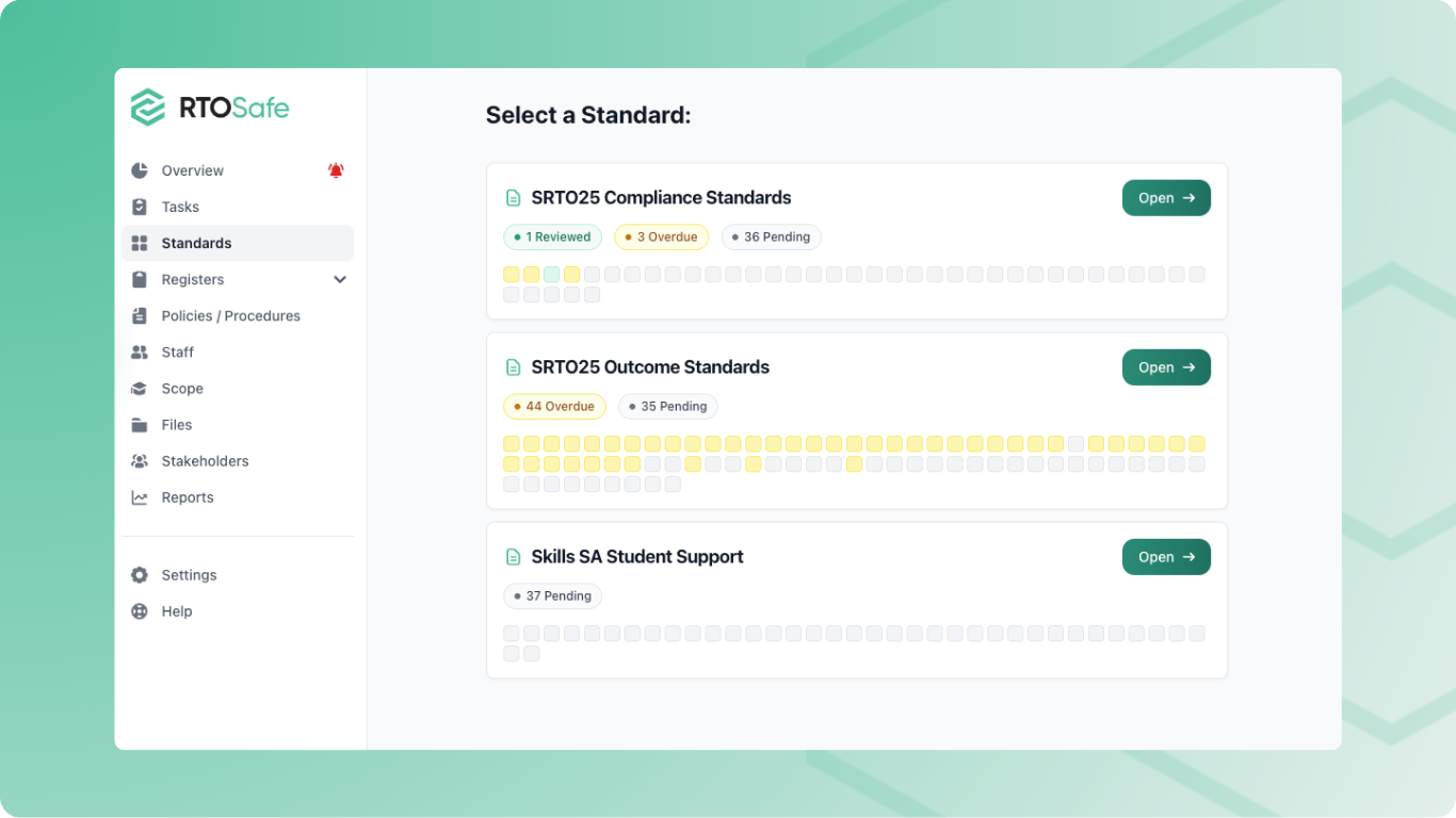 The Standards section helps you track how your RTO meets each requirement in your chosen standard set. You can review each clause, link evidence, and identify gaps in your policies.